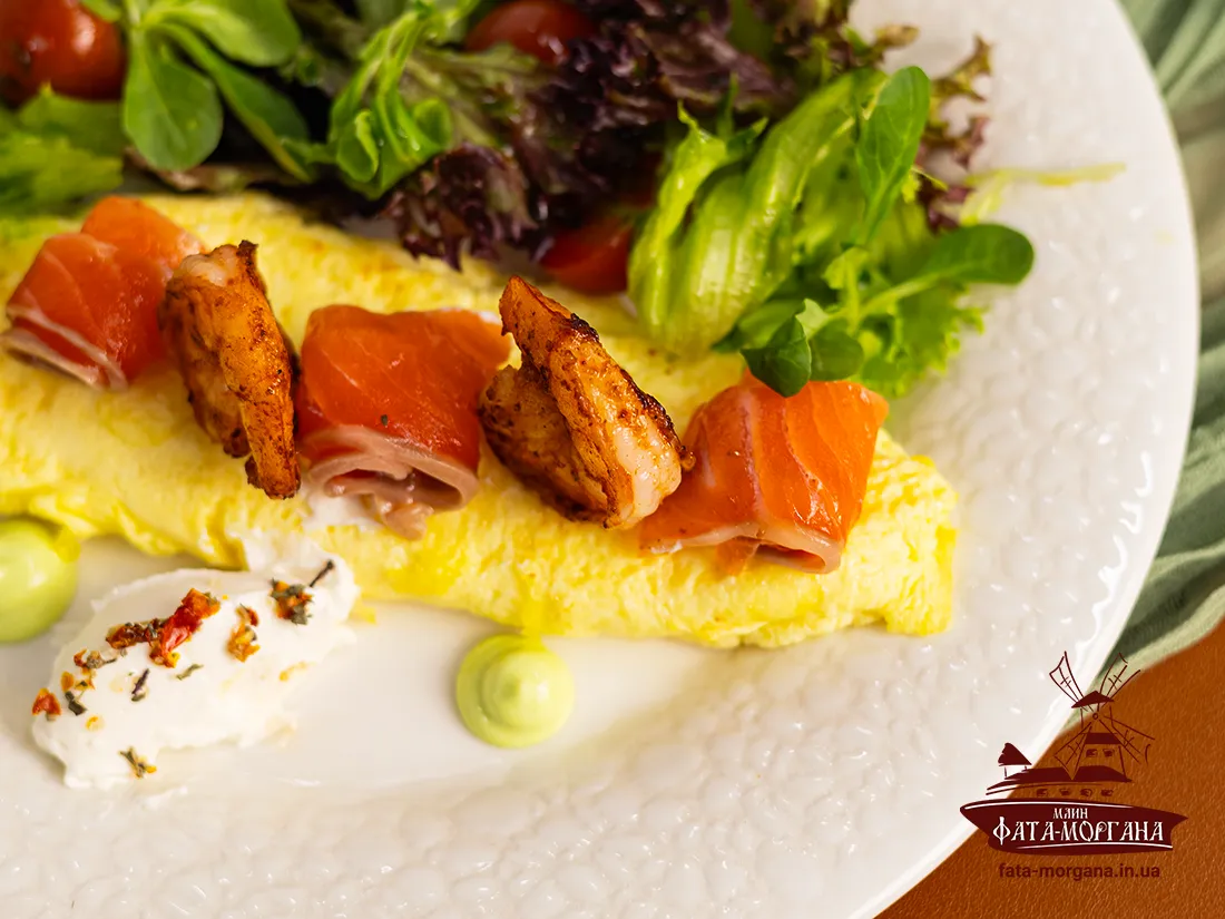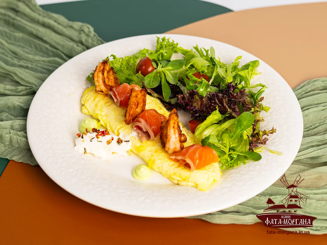 Скрембл з крем-сиром, лососем, креветками, мікс салату з томатами чері.
