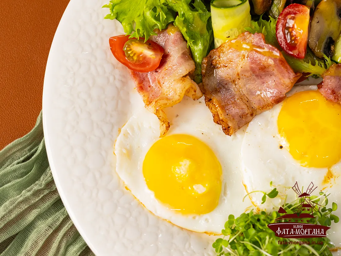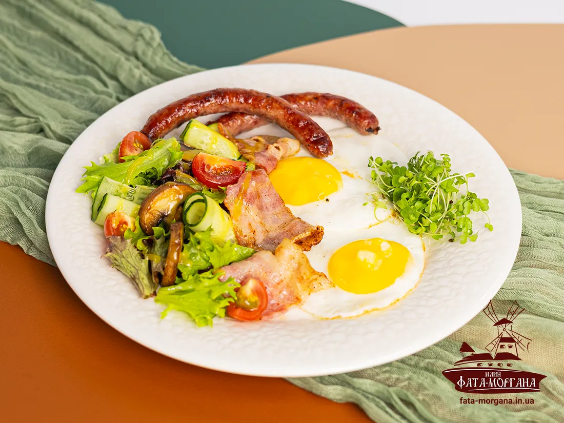 З хрустким беконом, ковбасками, міксом овочів та грибів.