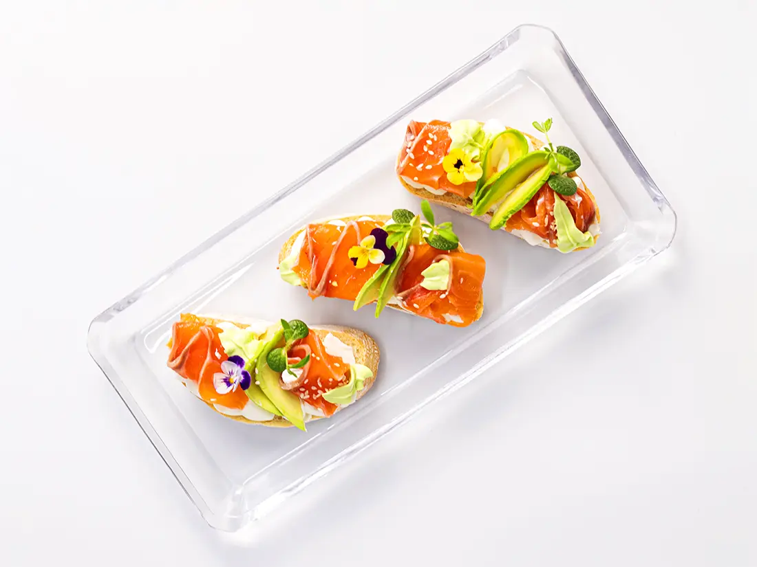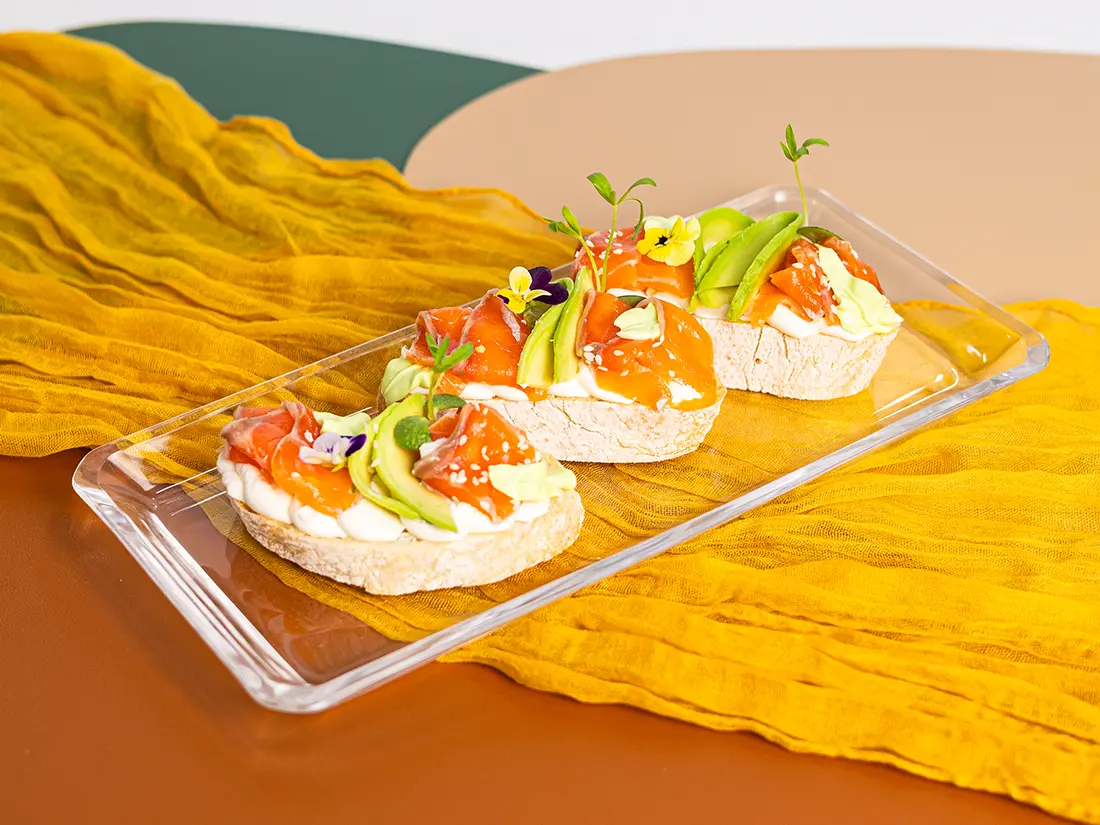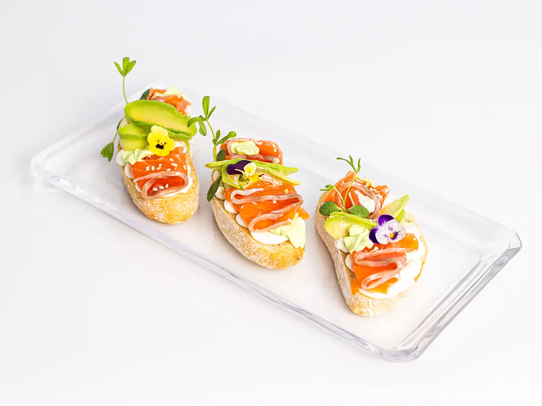 Ніжні брускети, де свіжість авокадо та м’якість крем-сиру поєднуються з вишуканим смаком лосося. Ідеальна страва для легкого обіду чи апетитної закуски до вина.